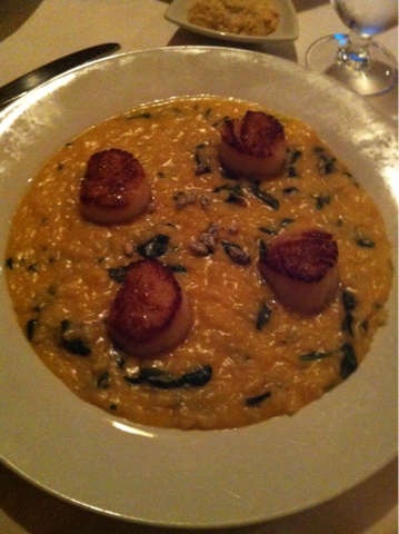 For my entree I had Sauteed Sea Scallops with butternut squash risotto an baby spinach. My sister had Maryland Crab Cakes. Both were very good. I love risotto so I was very happy to stuff my face.